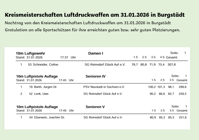 Nachtrag von den Kreismeisterschaften Luftdruckwaffen Verfasst vonmaik18.03.2026Veröffentlicht inSonstiges
